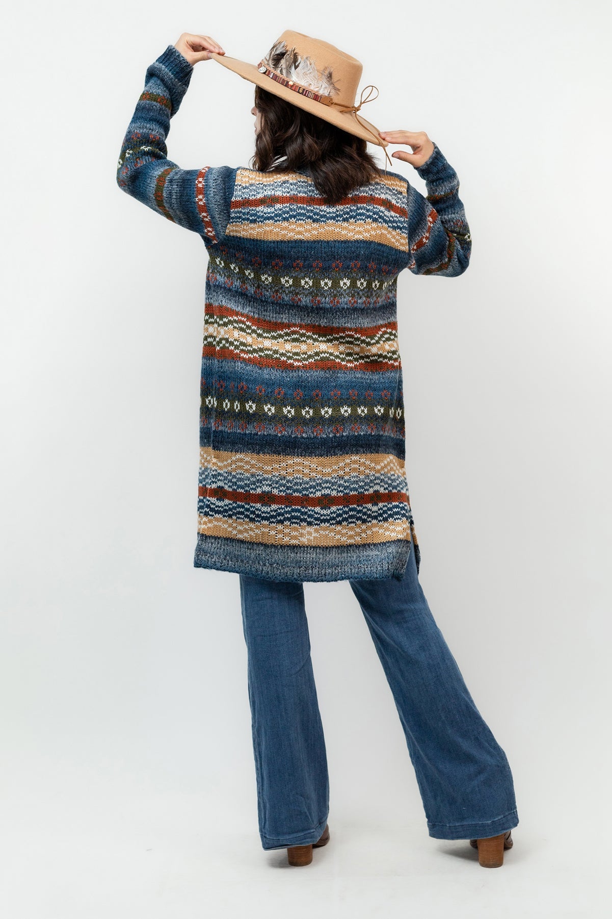 Knitted cardigan with long sleeves, open at the front. Blue color with fretwork design in brick, olive, mustard and bone