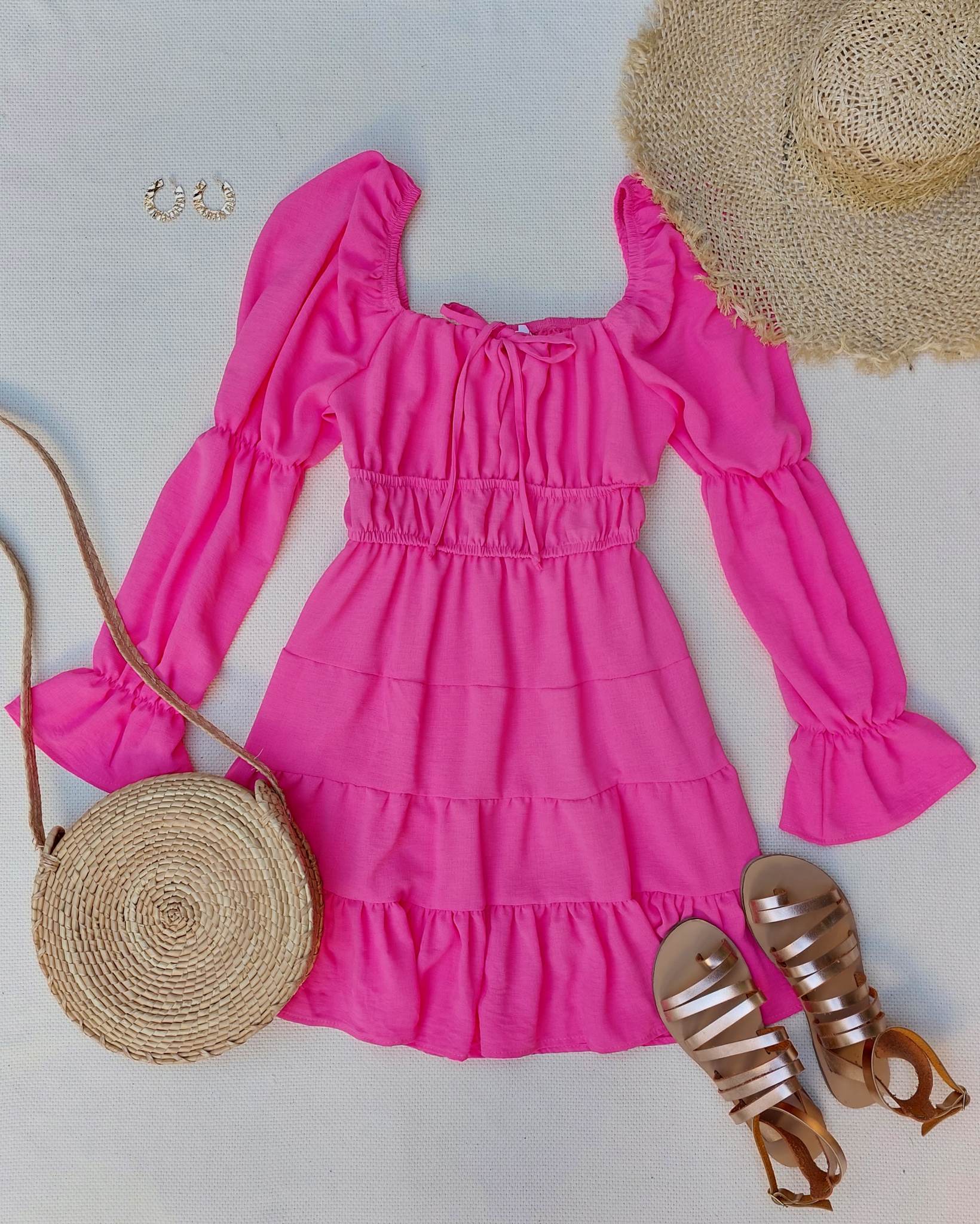 ¡El Vestido Estef es ideal para lucir perfecta y con estilo! Corto con olanes, amarre en escote, manga larga con elástico, forro de short y con un elástico en la cintura. ¡Incluye color rosa barbie y hecho de tela crepé 100% Poliéster! Disponible en tres tallas: CH, M y G. ¡No te pierdas esta increíble oportunidad!